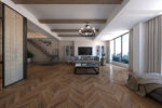 Сочетание классического шевронного пола с современными предметами мебели —